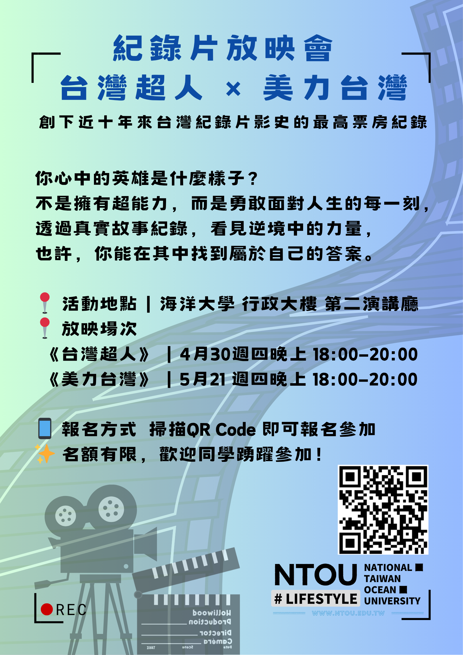 教務處特別規劃紀錄片放映系列活動,帶來《台灣超人》與《美力台灣》兩部感動人心的作品。其中《台灣超人》更創下近十年來台灣紀錄片影史最高票房紀錄,《美力台灣》則歷時十年,記錄台灣珍貴的自然景觀與百位傳統匠師,留下屬於這片土地的感動與記憶。透過真實故事傳遞勇氣與希望,帶領觀眾看見逆境中的力量,從他人的生命歷程中,找到屬於自己的答案。