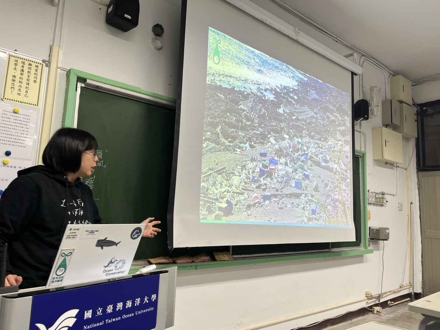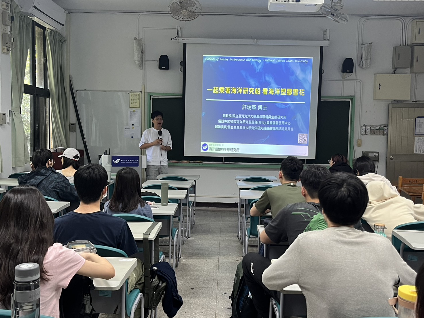 圖1-1-1 ,說明:許瑞峯副教授主講「一起乘著海洋研究船,看海洋塑膠雪花」,並提出「海洋塑膠雪花(Marine Plastic Snow)」概念,並率先揭露微塑膠污染入侵黑潮主軸的證據,目前亦成功開發奈米塑膠濃縮與偵測技術,為全球海洋奈米塑膠污染與生態風險的全面評估奠定關鍵基礎。